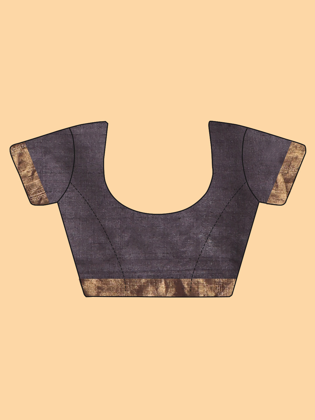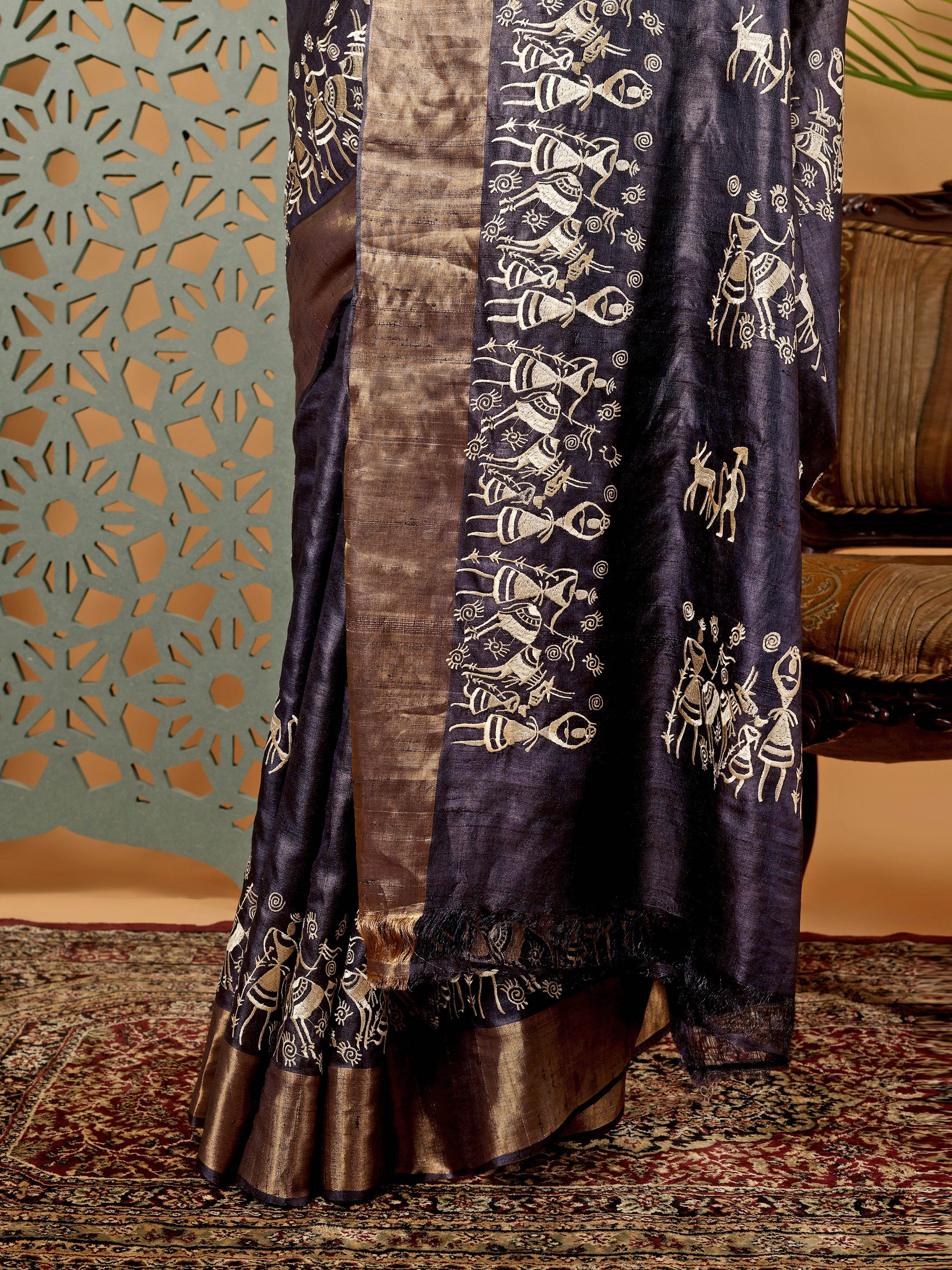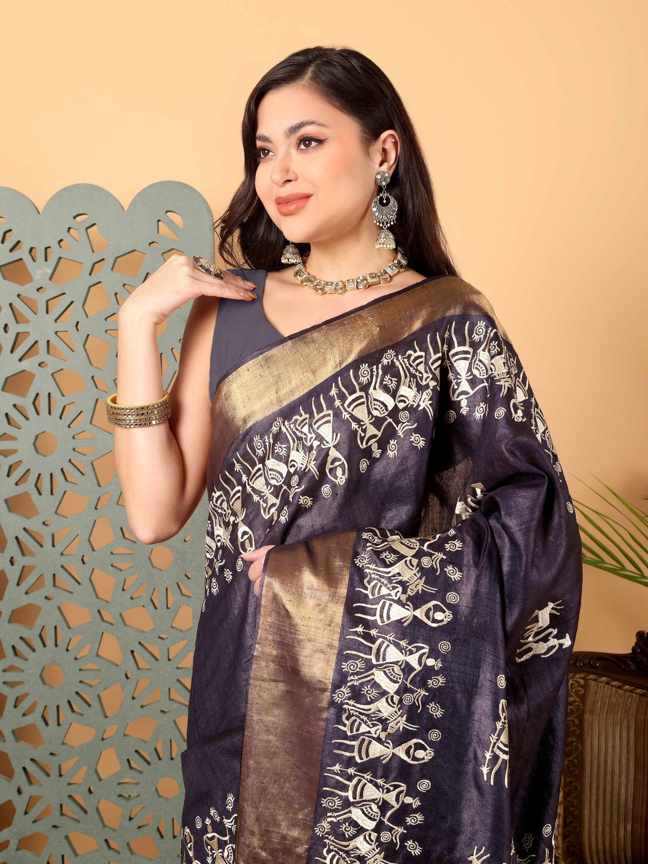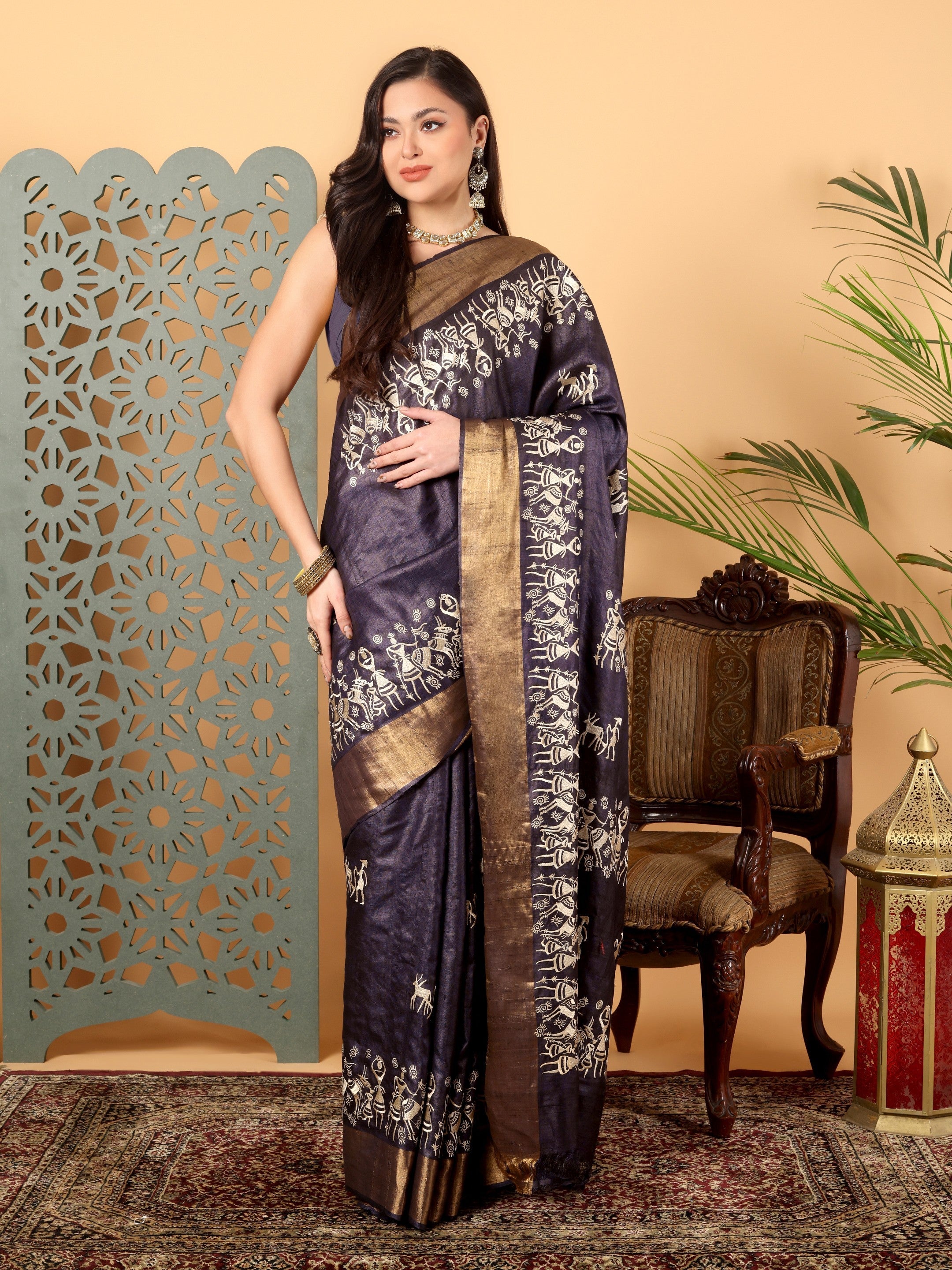 Crafted in Chhattisgarh from pure Kosa silk, this saree features a deep indigo base highlighted withEmbroidered tribal motifs and a rich golden border. The natural golden sheen of authentic Kosa enhances its understated luxury.