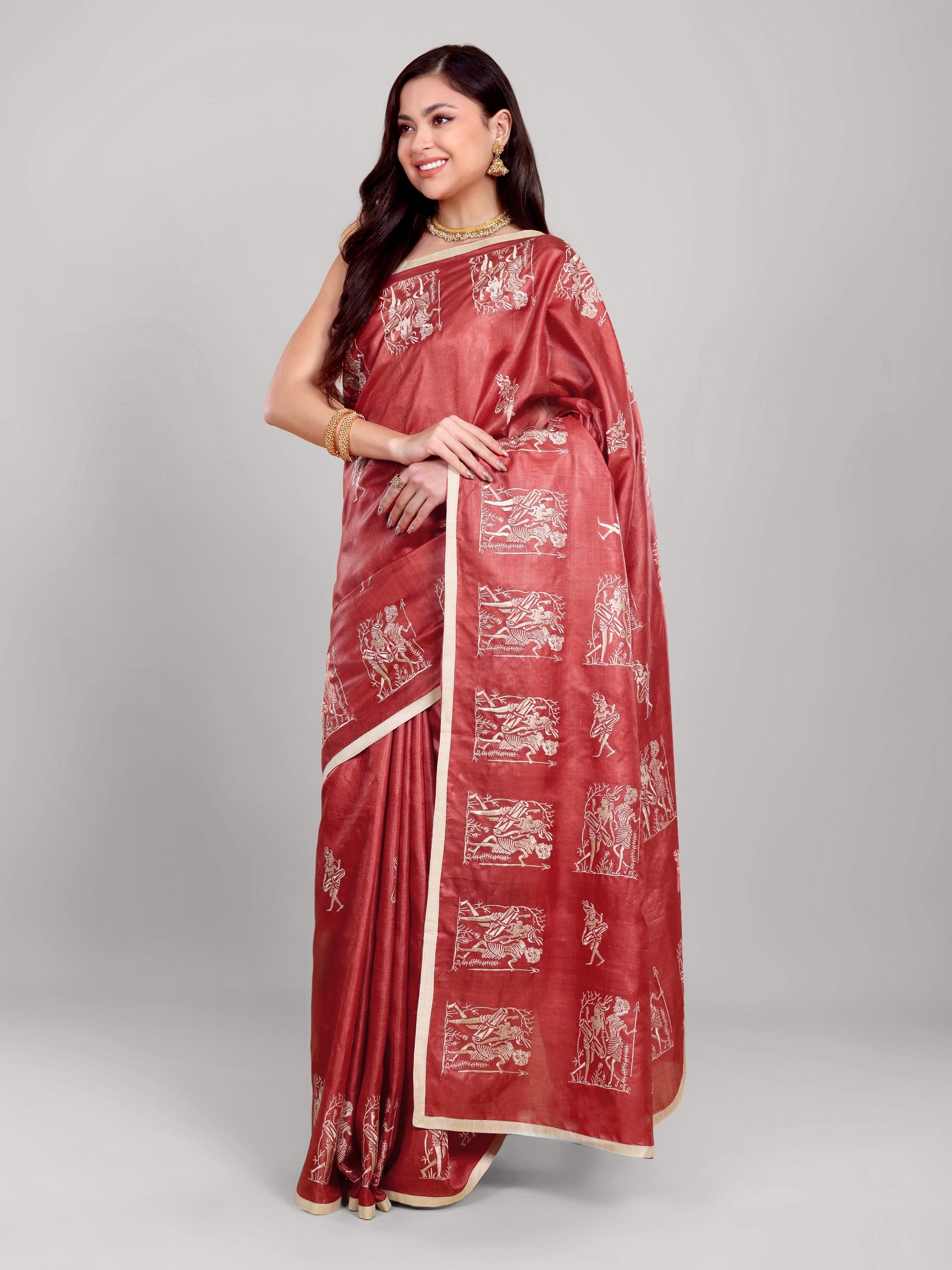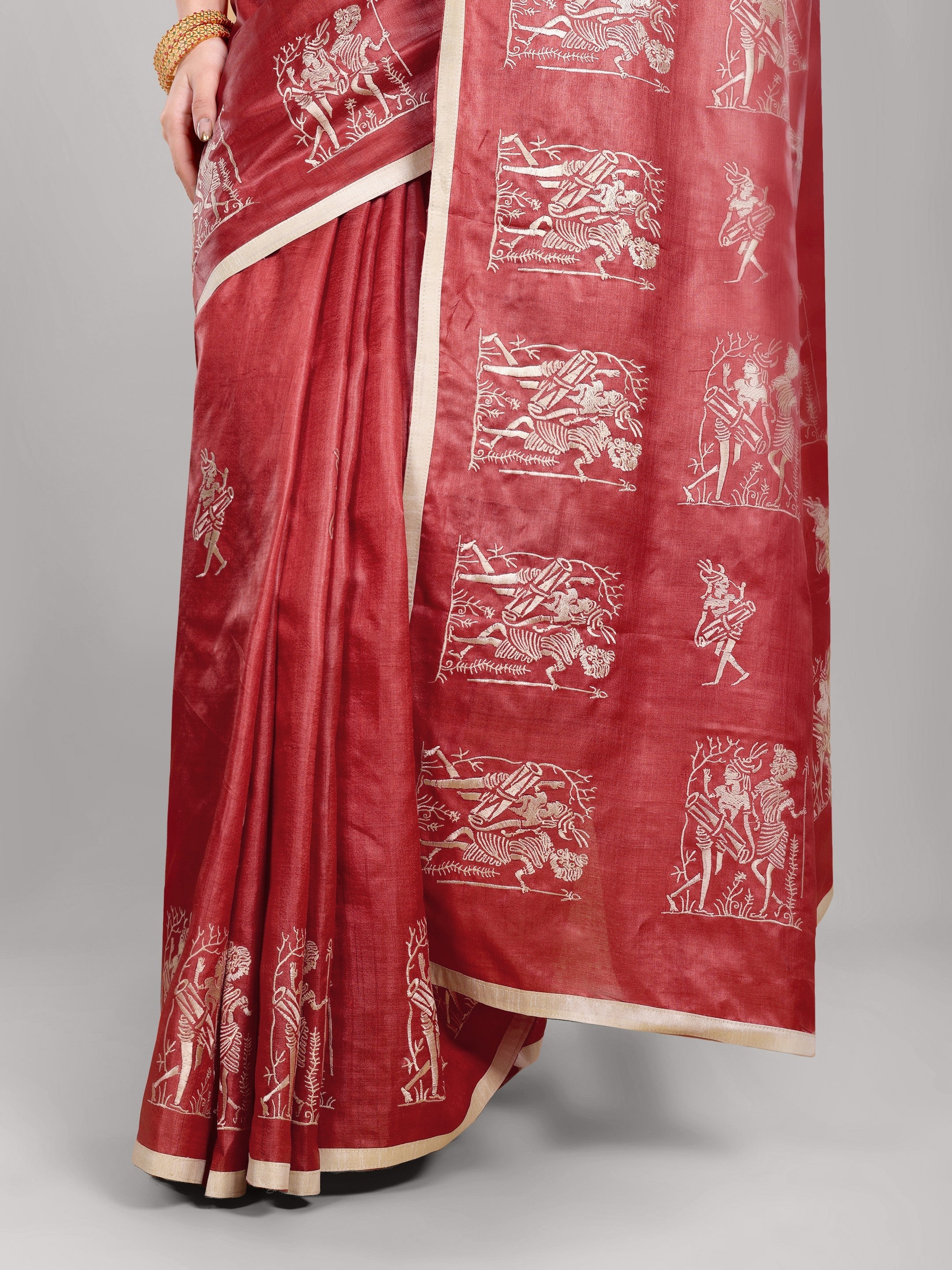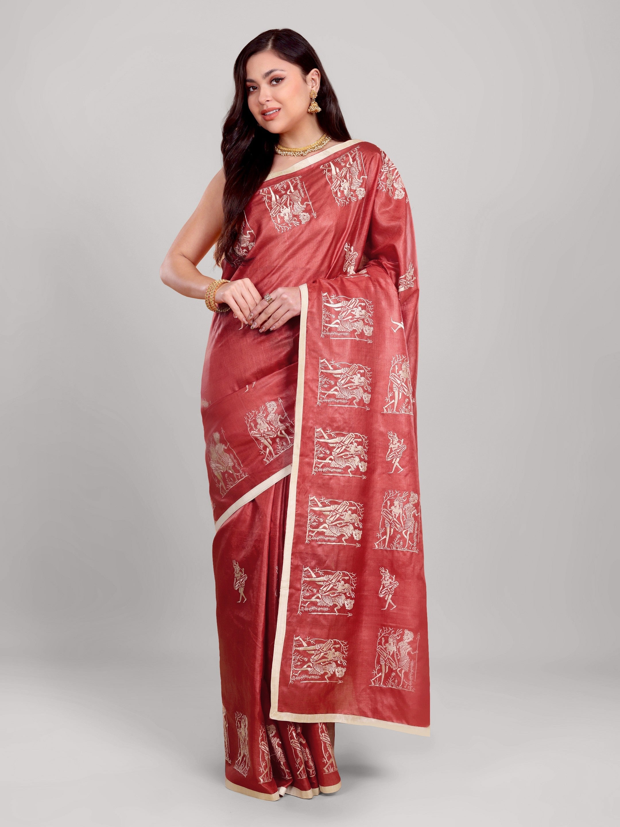 Crafted in Chhattisgarh from pure Kosa silk, this saree features intricate embroidery motifs arranged in artistic panels across a deep terracotta base. The natural golden sheen of authentic Kosa enhances its warmth while maintaining understated luxury.